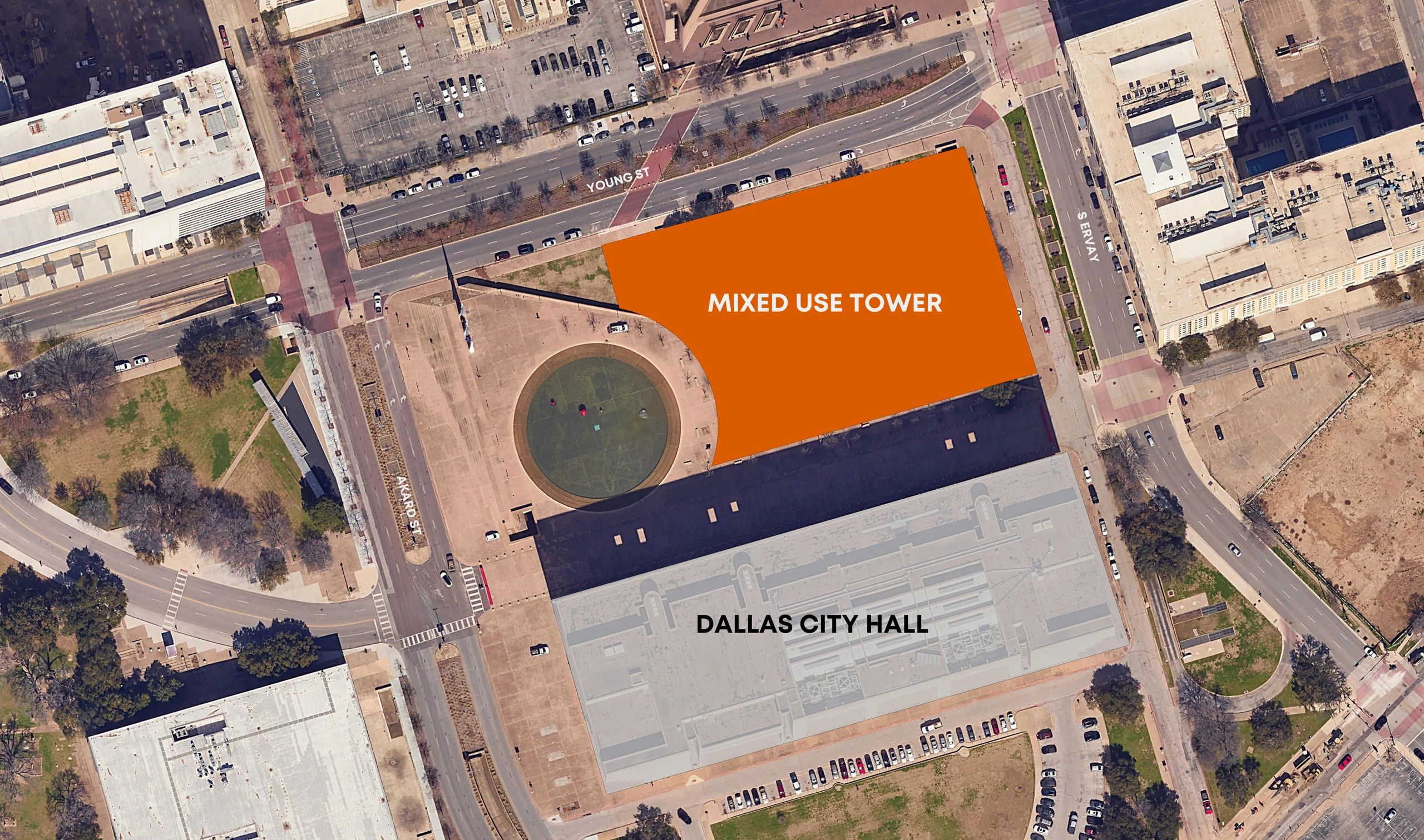 Allerior's proposal also includes a comprehensive redesign of the City Hall plaza. Currently vast and largely uninhabitable in the Texas heat, the plaza would be transformed through strategic landscaping with trees and grass, creating a shaded park-like environment scaled to the demonstrations and civic gatherings Dallas realistically hosts. Morrison believes accessible, shaded public space will meaningfully increase civic participation, particularly during summer months when residents are free from work and school.